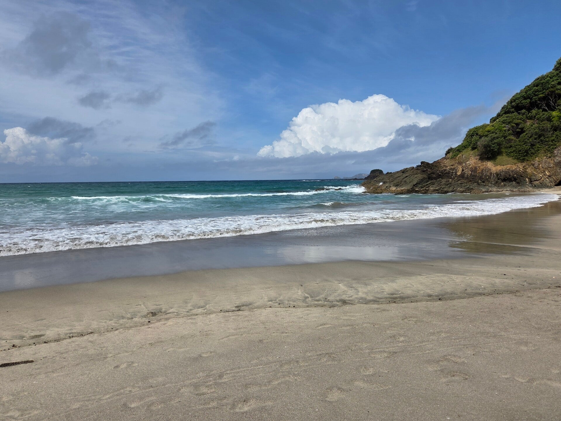 Wir haben gestern noch um eine Nacht verlängert und spazieren heute nach Orewa an den Orewa Beach. Er ist riesig, viel grösser als der Red Beach und sehr schön. Beim Camper zurück gehen wir nochmals an den Red Beach, da wir ihn gestern nur bei Flut besucht haben, als man kaum Strand hatte. Nun können wir auch etwas weiter spazieren und auch einige rote Stellen sehen, die ihm wohl den Namen gegeben haben.😃