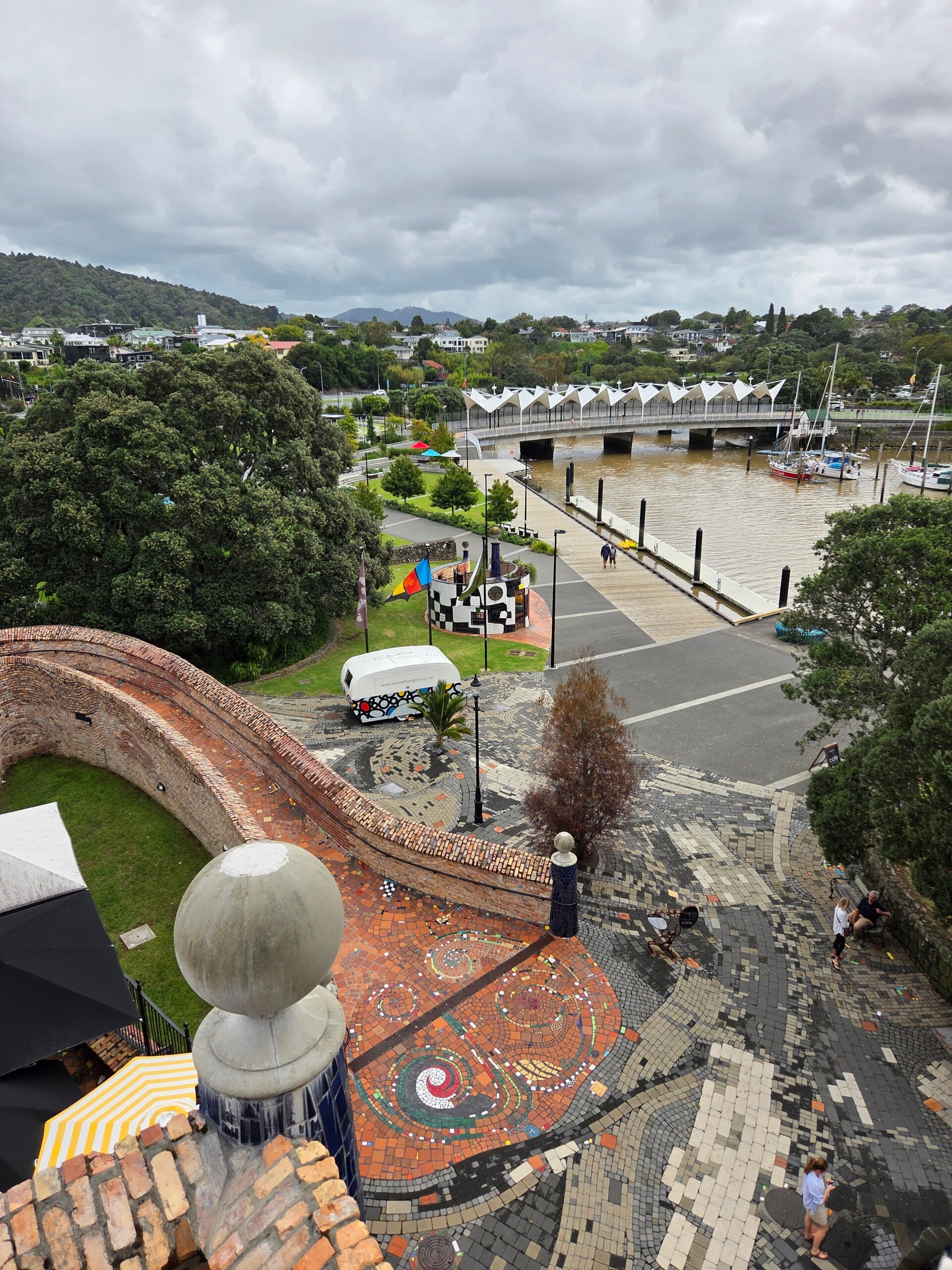 Die Wetteraussichten für hier sind noch nicht viel besser, also entschliessen wir uns Richtung Süden, wo das Wetter besser sein sollte, weiterzufahren. Aber natürlich nicht ohne Kaffee und Chai. 😉 Wir fahren nach Whangarei hinein und finden ein schönes Kaffee. Da ich mich, mit meinen in der Zwischenzeit für meine Verhältnisse langen Haare, schon eine Weile nicht mehr so wohl fühle, google ich mal nach Hairdressers und finde tatsächlich hier in Whangarei einen, der heute am Sonntag offen hat. Und das nur 5 Minuten zu Fuss vom Kaffee. Also nichts wie hin. 😀 Da noch Morgen früh ist, ist der Salon leer und wir können beide unsere Haare schneiden lassen. 😅 Wir lassen den beiden Herren freie Hand. Ihr könnt sehen, was dabei herausgekommen ist. 😉 Aber Hauptsache kurz und nicht mehr so viele Haare! Manchmal bin ich mir wie ein ungeschorenes Schaf im Sommer vorgekommen. 😂 Auf dem Weg zum Parkplatz zurück kommen wir am Huntertwassermuseum vorbei. Huntertwasser hat hier von 1973 bis zu seinem Tod 2000 gelebt. Das Wetter ist doch optimal für einen Museumsbesuch, der sich auch gelohnt hat. Da es nicht regnet, fahren wir noch in die Whangarei Heads hinaus an den Strand. Der Weg zum Strand ist steil, also montiere ich bei meinen Crocks den 4 wheel drive. 😆 Wir haben inzwischen unser Frisurenstyling schon etwas angepasst. 😉 In Whangarei zurück, fahren wir zügig auf der HW1 gegen Süden nach Orewa. Einige Kilometere vor Orewa ist die HW1 kostenpflichtig. Was für ein Genuss! Einmal eine Strasse ohne Bodenwellen, Löcher und Absenkungen. 😅 Die Strassen in Neuseeland sind wirklich nicht gerade die besten. 😏 Einen Vorteil haben sie zwar. Ich werde von meiner Uhr öfters gelobt, dass ich das Treppensteigenziel 10fach übertroffen habe, dank der holprigen Fahrt. 😉 Wir sind ja eigentlich nicht so überzeugt von dwn Top10 Campingplätzen, aber dieser hier in Orewa ist eindeutig über alles gesehen der schönste Campingplatz von allen, auf denen wir waren. Wir haben aber auch für einmal die schönste Parzelle (Nr. 3) erhalten. Die Parzelle ist riesig, gegen rechts und links mit einem Holzzaun abgegrenzt und einem Gärtchen mit Gewürzen, Salat und Gemüse. Die Toiletten und Duschen extrem schön und die Lage des Platzes durch ein Tor direkt am Strand. Zwar keine Meersicht und etwas Algen am Strand aber sehr ruhig gelegen. 😀
