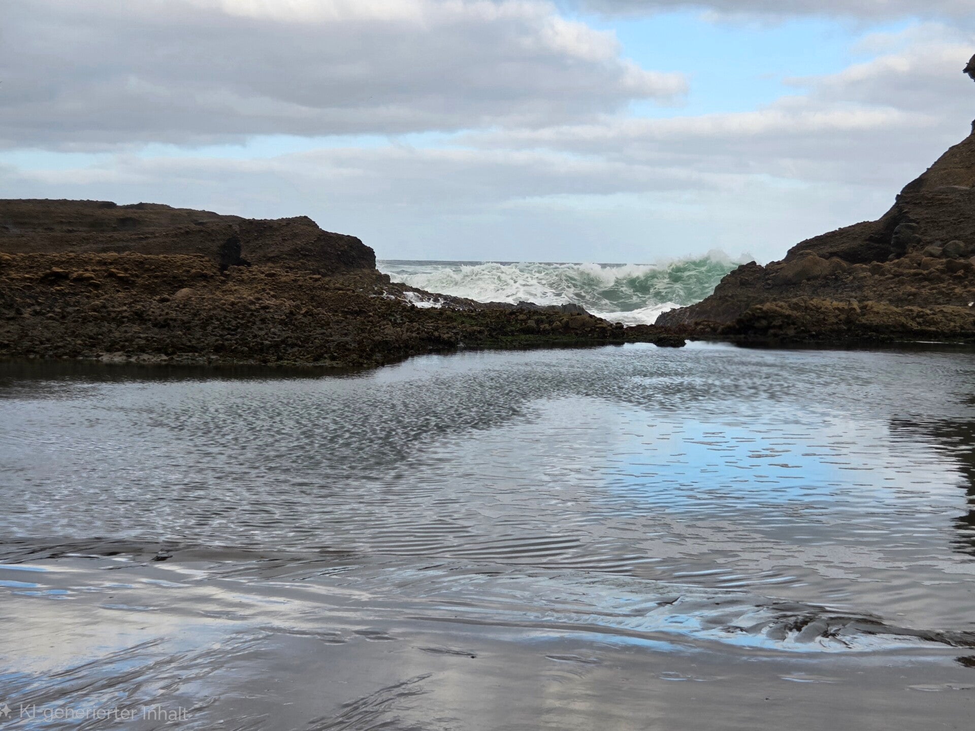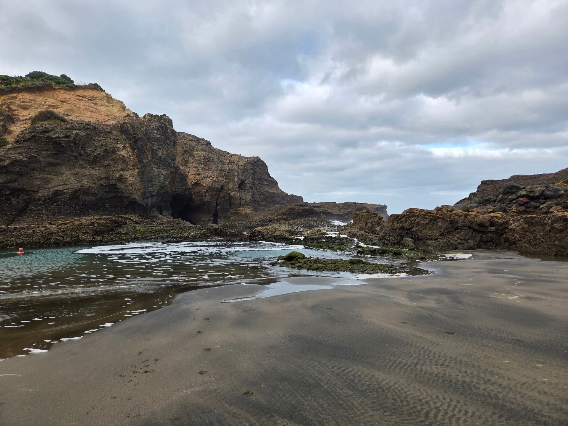Wir haben ruhig, ohne jeglichen Lärm, nur mit Meerrauschen geschlafen. 😄 Bei Ebbe gibt es vom Campingplatz aus ein Weg dem Strand entlang zu einer Bucht. Da am Morgen Ebbe ist machen wir den bevor wir weiterfahren. Wir sind alleine unterwegs ausser ein Mann auf Velo, der in der Bucht zuhinderst nackt baden geht😉. Als wir ihn treffen, ( wieder bekleidet😅) empfiehlt er uns noch weiterzugehen, da es weiter hinten dann ein Blowhole habe. Wir gehen weiter aber schon bald ist der Weg gesperrt und wir drehen um.