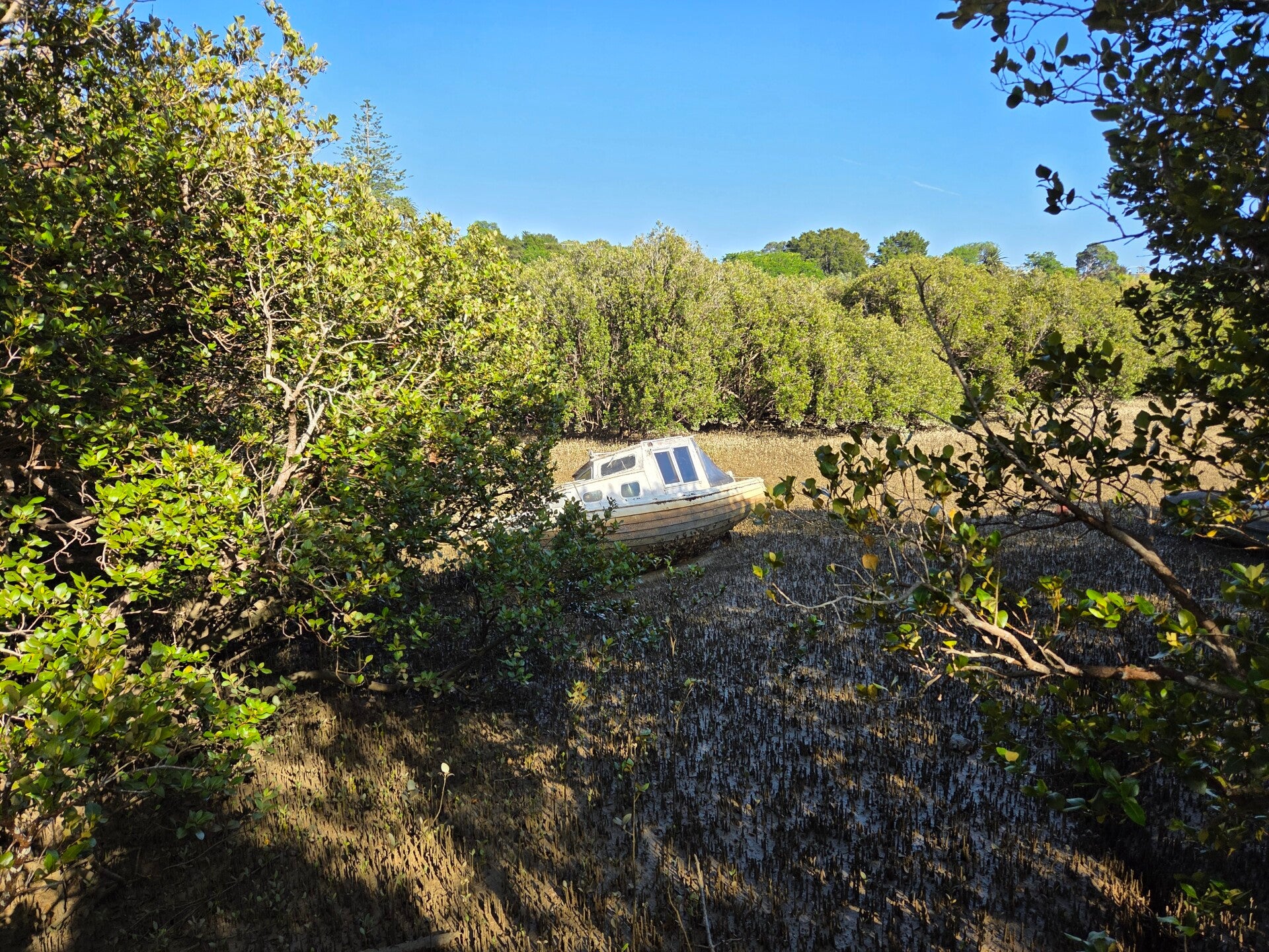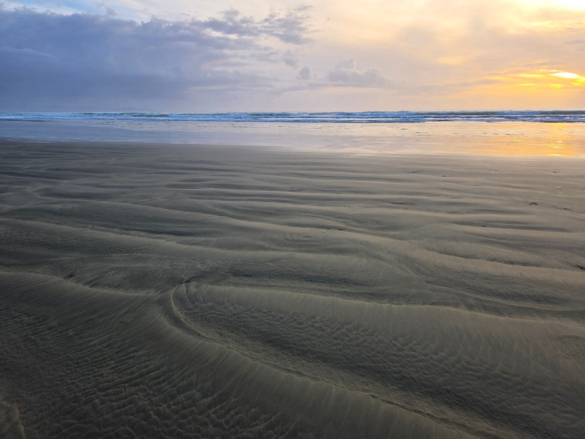 Am Morgen liegt Nebel über dem Fjord. In Rawene spazieren wir über den Mangrove Boardwalk und geniessen Kaffee und Chai im Boatshed Cafe.😄 Unser Kaffee- und Chaikonsum liegt sicher bei mindestens 2/Tag. Einen Tag ohne Kaffee und Chai können wir uns nur schlecht vorstellen.😉 Gehört irgendwie zum Tagesritual.😅 Wir wählen nicht den Weg mit der Fähre für die Weiterfahrt, weil Ebbe ist und auf der Homepage steht, dass bei Ebbe ev. nur PW's transportiert werden können. Also fahren wir zurück zur HW 12, dann kurz auf der HW1 und dann auf die Broadwood Road, da diese weniger befahren ist. Unser Ziel ist der Ngapae Holidaypark am südlichen Anfang des 90 Mile Beach, den man auch mit einem Allradfahrzeug befahren könnte. Der Campground ist fast leer und wir haben viel Platz😄. Die Frau am Empfang erklärt mir, wie wir am Strand ganz einfach Shellfish (Muscheln) fangen können. Der Strand ist nur 5 Minuten zu Fuss entfernt, also los, nichts wie hin mit 2 Ziplocs bewaffnet. Und tatsächlich haben wir im Nu genug Muscheln gefangen und können noch in den Wellen baden. Da wir neben den Kleidern auch Brillen Handy's und Kurt seine Pumpe am Strand lassen, legen wir alles möglichst nah beim Wasser hin, damit wir alles im Auge haben und es nicht ev. noch von einem Auto überfahren wird. Um diese Zeit sollte ja das Meer zurückgehen. Kaum im Wasser, haben wir das Gefühl, dass die letzte Welle fast unsere Sachen erreicht hat. Ich rasch raus und es ist tatsächlich so😅. Auf dem Campingplatz wasche ich die Muscheln und koche uns eine Vorspeise. Der Geschmack ist gut aber sie sind etwas zäh.😏 Ich habe sie wohl etwas zu lange gekocht, sind sie doch kleiner als Miesmuscheln. Nächstes Mal gelingts besser.😉 Passend zur Vorspeise gibt es im Hauptgang feinen Snapper.😋 Und zur Nachspeise Sonnenuntergang am Strand.😆