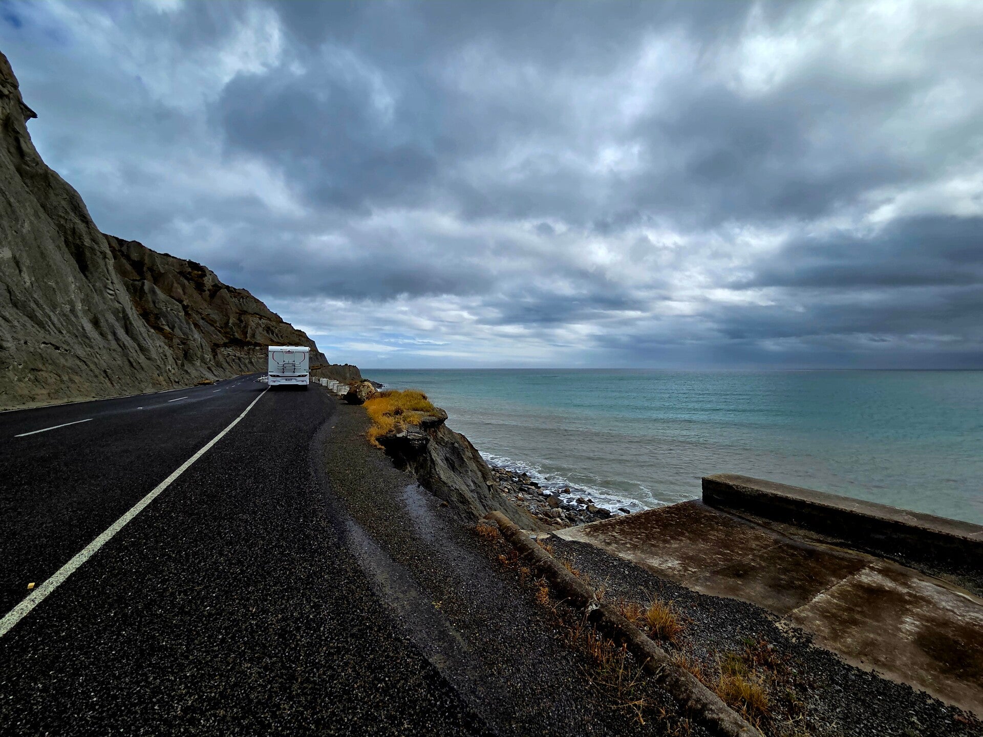 Der Morgen ist grau und es beginnt wieder einmal zu regnen.😏Wir haben eigentlich geplant noch in den Zealandia Park zu gehen und ein wenig auf Tierfotopirsch zu gehen. Da es aber immer stärker regnet, würden wir wohl nicht viele Tiere sehen und wir entscheiden uns weiterzufahren. Die Strasse nach Martinborough, wo wir eigentlich übernachten wollten, führt durch schöne, dichte Wälder. Da es aber so neblig ist, sieht man leider kaum etwas. In Martinborough regnet es immer noch, daher fahren wir nach dem Lunch weiter Richtung Cape Palliser, dem südlichsten Punkt der Nordinsel. Unterwegs sitzen immer wieder ganze Vogelschwärme auf der Strasse und fliegen immer erst kurz bevor wir sie erreichen weg. Bei einigen fehlt nicht viel, dass sie uns in die Windschutzscheibe fliegen. Ich frage mich, warum sie wohl alle auf der Strasse sitzen und erst so spät wegfliegen.🤔 Machen die vielleicht eine Mutprobe? 😅 Als wir die Küste erreichen, sehen wir immer wieder Stellen, wo das Meer sich Teile der Küste erobert und die Strasse am Rand abgebrochen ist. Wir übernachten einige Kilometer vor dem Cape Palliser im Waimeha Camping Village. Super dieser Platz.😄 Unsere Parzelle ist etwa 10x20m gross, wir haben Meersicht, haben keine direkten Nachbarn und ein Schaf, das uns besucht. Der Platzbesitzer weist uns an, den Camper in Nord-Südrichtung zu parkieren, da in der Nacht starke Windböen und starker Regen angesagt ist. Unterdessen kann uns das nicht mehr beunruhigen. Wir sind uns nun solche Wetterverhältnisse schon gewohnt.😅 Da es im Moment etwas aufklart, machen wir noch einen Strandspaziergang, bis es erneut zu regnen beginnt. Nun ist es stockdunkel draussen, wir sitzen im Camper, Kurt löst ein Sudoku, ich schreibe diesen Text, es regnet stark und windet wie vorhergesagt und wir sind froh, dass wir im Trocknen sitzen.😅 Gute Nacht.😃😴