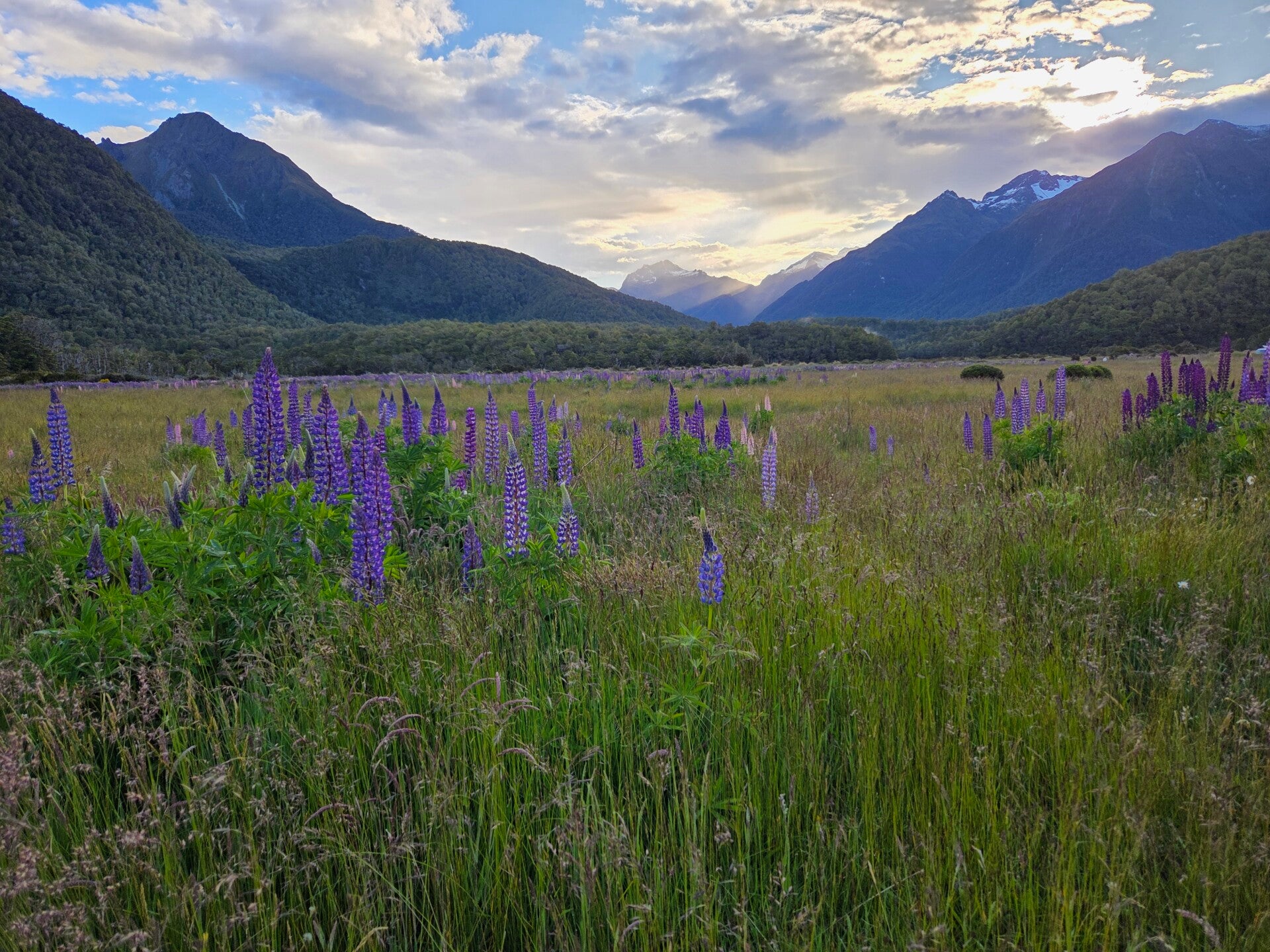 Weiter geht’s der Highway 94 Richtung Milford sound. Da wir erst vorgestern geschaut haben, auf welchem der DOC Plätze wir die 2. Nacht verbringen wollen, sind die meisten schon ausgebucht. Uns bleibt noch der Deer Flat Campsite. Auf dem Weg dorthin wandern wir auf dem Lake mistletoe track, besuchen lookouts und das Eglinton valley und flats. Im Mirror lake kann man bei ruhigem Wasser die Landschaft sehr schön gespiegelt sehen. Leider war das Wasser unruhig. 😏Also kein Spiegel! Wir sind noch früh unterwegs, also schauen wir uns den Deer Flat Campsite doch mal an. Er ist sehr klein und überzeugt uns nicht gerade. Er ist auch wieder matchig und nicht sehr einladend. Wir beschliessen weiterzufahren bis zum nächsten Punkt, wo wir Internet haben (es sind dies 5 Punkte auf der ganzen Strecke) um auf der Onlinereservationsseite (man kann nur so buchen) zu schauen, ob der Cascade creek Campsite (140 Plätze), den wir bereits für Silvester, nach dem Milford sound reserviert haben, nicht doch noch einen freien Platz hat. Chancenlos.🙁 Wir drehen um und wollen uns den Platz mal genauer anschauen. Der Platz ist riesig und noch fast leer. Von den 140 Plätzen sind etwa 100 mit Schildern nummeriert. Was ist mit den 40? Sind die wohl Reserve und doch noch nicht vergeben? Haben wir überhaupt am 31.12. eine Platznummer bekommen? Leider habe ich das pdf mit der Bestätigung noch nicht heruntergeladen. 🙄Also nochmals zurück zum Internetpoint. Dabei fahren wir am wunderschönen Lake Gunn vorbei. Wir haben keine Platznummer. Also wieder zurück zum Cascade Creek Campsite wo wir eine Frau fragen, ob sie eine Platznummer hat. Sie verneint. Mmh. 🤔Jetzt könnten wir ja pokern und einfach einmal bleiben. Wir haben ja einen Platz gebucht, einfach nicht diesen. Und beim letzten DOC-Platz hat der Kontrolleur nur unseren DOC-Pass angeschaut und dann Daumen hoch gezeigt. Wir haben kein schlechtes Gewissen, da wir mit dem DOC-Pass (1 Jahr gültig) alle DOC Campingplätze bereits bezahlt haben und nur noch reservieren müssen. Wir wagen es also. Der Kontrolleur kommt um 18 Uhr, ich zeige auf den Pass an der Windschutzscheib und er zeigt Daumen hoch. Uff.😅 Wir freuen uns, dass wir in dieser schönen Landschaft mit tausenden von Lupinen übernachten dürfen. Vor allem die Chinesen können sich nicht sattsehen an diesen und machen ein Selfie nach dem anderen. Eigentlich sind die Lupinen ja Neophyten und bei uns auf der Bettmeralp wird man angewiesen, sie zu entfernen. Ich kann noch schöne Abendsimmungen fotografieren und wir schlafen herrlich, da wir auch kein schlechtes Gewissen haben müssen, da der Campingplatz noch einige freie Plätze hat. 😉Am Morgen unternehmen wir noch den Lake Gunn walk, wo wir eine schöne Aussicht auf die Schneeberge und eine Vorahnung auf den Milford sound haben.