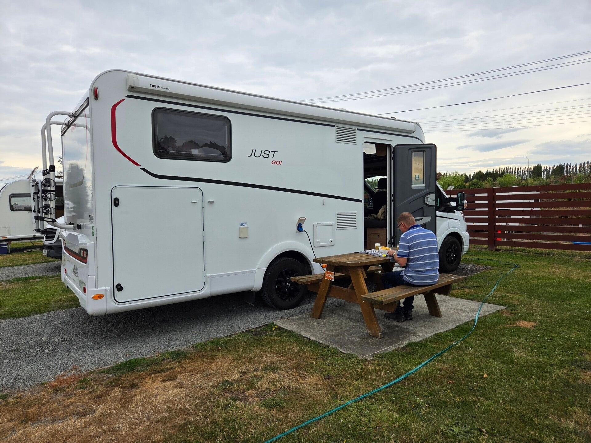 In der Nacht haben der Camper und wir uns weiter angefreundet und es ist auch zu keinen weiteren Zusammenstössen gekommen😉. Der Campingplatz ist aber etwas laut, gtosse Strassen in der Nähe, in denen die ganze Nacht Autos fahren und Lastwagen mit automatischer Motorbremse. Auf dem Camping wohnen auch Arbeiter, die entweder spät am Abend von, oder früh am Morgen zur Arbeit fahren. Wir nehmen noch kleine Umrüstungen im Camper vor und machen danach einen Spaziergang ins nahegelegene Roto Kōhatu Reserve und geniessen die Ruhe und die tief fliegenden Flugzeuge😅,da der Flughafen ganz nah ist. Uns fehlen noch einige Acessoires im Camper, also fahren wir zu einem Campershop und noch ins Woolworth Lebensmittel für die kommenden Tage einzukaufen, denn morgen gehts weiter Richtung Süden. Da das Auto kein Navi hat, leite ich mit dem Handy. Kurz vor dem Ziel zeigt mir das Navy 2 mögliche Wege an, beide gleichlang. Ich entscheide mich für die Variante und kurz darauf gersten wir in eine Polizeikontrolle.🫢Der Polizist weist uns an zu stoppen. Er hält Kurt ein Gerät vor den Mund und lässt ihn dabei auf 5 zählen. Er schaut auf das Gerät und sagt mit breitem Grinsen nur "pass"🤔 Ich frage ihn ob das ein Alkoholtest war und er bejaht es. Wenn das Gerät pass anzeige, sei alles gut und man kann weiterfahren, wenn nicht, muss man noch blasen, wie bei uns. Er verabschiedet uns immer noch mit einem breiten Lachen.😃 Bis jetzt haben wir wirklich nur alles überfreundliche Kiwis angetroffen.😊 Auf dem Campingplatz zurück erhalten wir noch Besuch von einer Entenfamilie.🥰