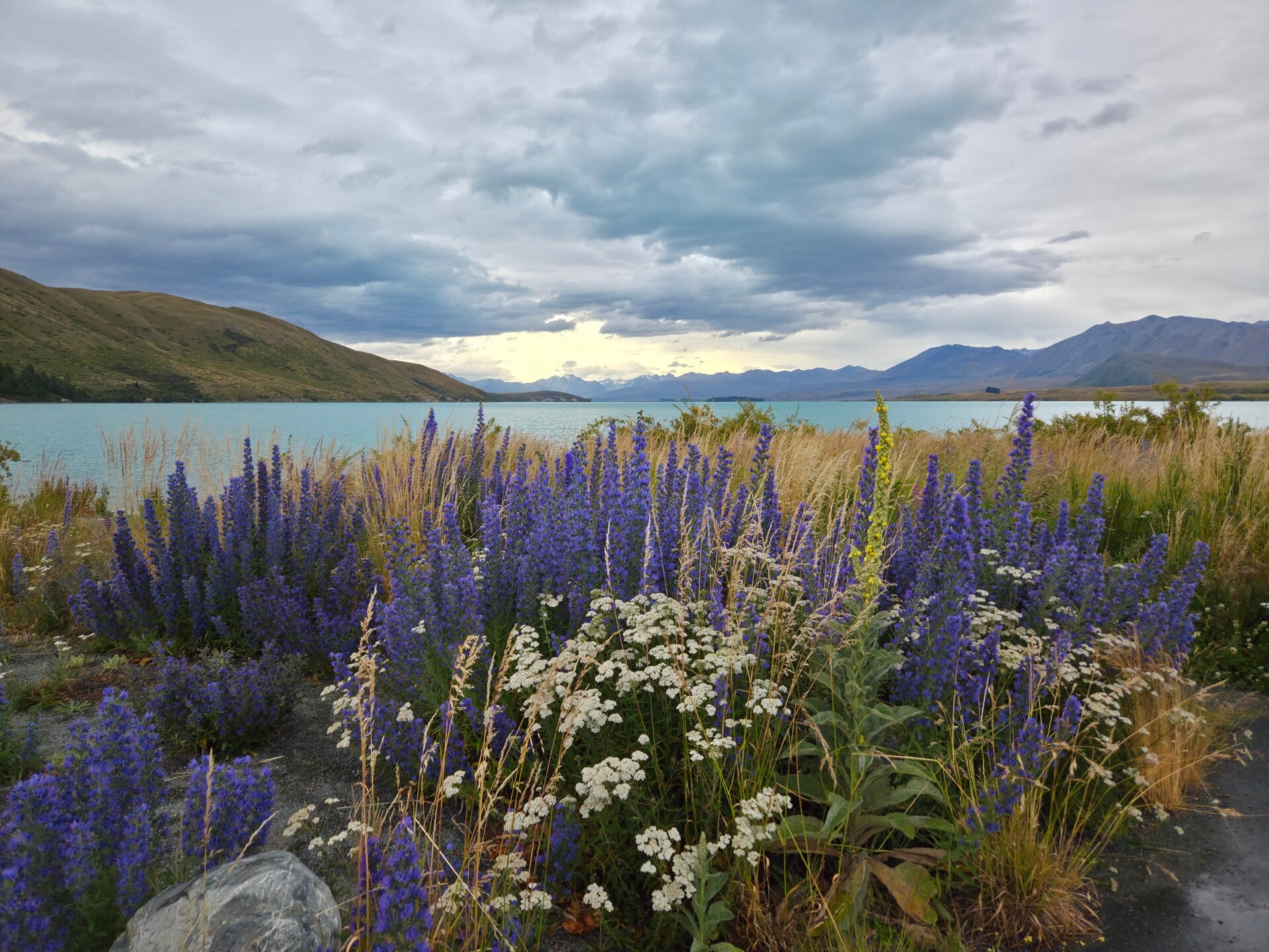 Für die Fahrt zum Lake Tekapo wählen wir die Route über das Waitiki Tal. Die Landwirtschaft im Waitaki-Tal ist stark durch Bewässerung geprägt, wobei der Waitiki River und seine Stauseen eine entscheidende Rolle spielen, um über 10.000 Hektar Ackerland zu bewässern, was das Wachstum von Weideland und die Viehzucht (Schafe, Rinder) unterstützt. Die Region profitiert von einem guten Bewässerungssystem und vergleichsweise sauberem Wasser, aber auch von der Energieversorgung durch die Wasserkraftwerke. Unterwegs besichtigen wir Felsmalereien der Maiori und die tiefblauen Lupinen stehen immer öfters in grossen Gruppen am Strassenrand. Der Lake Pukaki erstrahlt je nach Lichteinfall in einem satten türkis. Überhaupt sind hier in Neuseeland, wegen der starken Sonne viele Farben viel intensiver. 🙂 Am Lake Tekapo sind wir auf dem Lakes Edge Holiday Park. Er ist super gelegen und sehr schön. Die Abendstimmung mit eher bewölktem Wetter mit zum Teil durchsickernder Sonne ist einmalig.